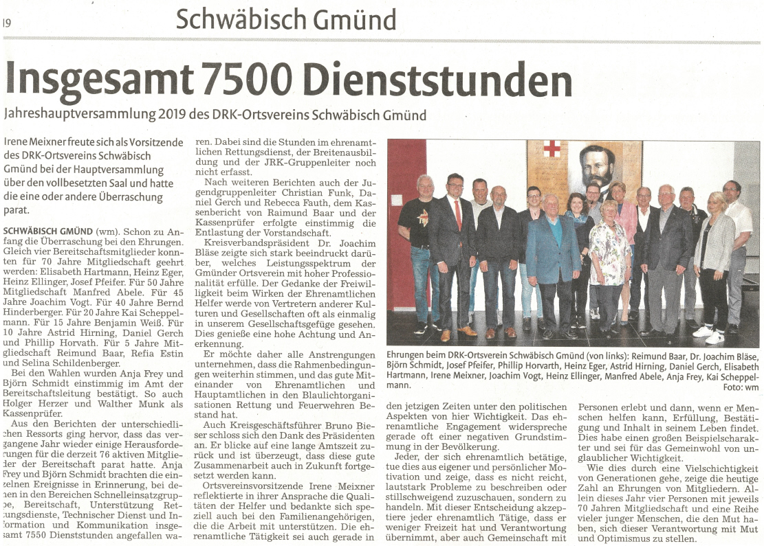 14. Mai 2019 10:05 Rems-Zeitung berichtet über OV Versammung Die Rems-Zeitung berichtet heute über die Ortsvereinsversammlung des DRK OV Schwäbisch Gmünd am 11.04.2019.
