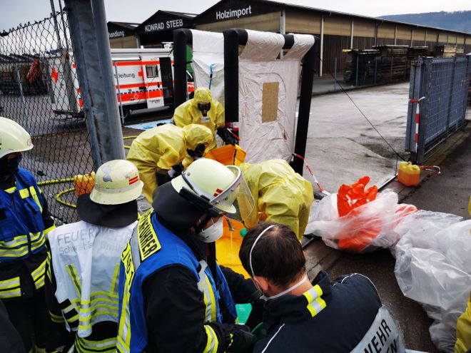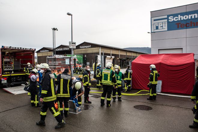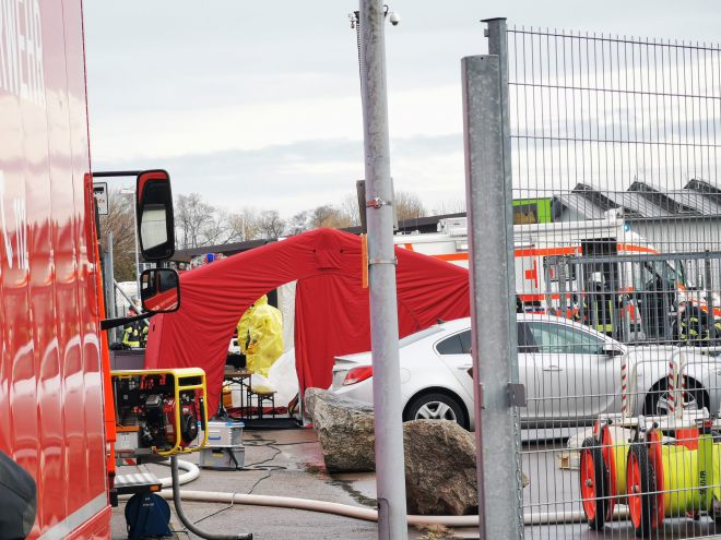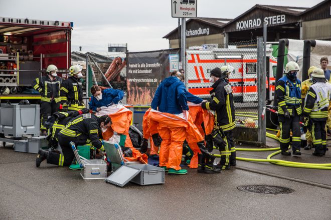 Beim Ausladen einer Kanisterlieferung bemerkten die Arbeiter einen „komischen Geruch“, teilt die Polizei mit. Zunächst sei man von einer alkalischen Lösung ausgegangen, die sehr gefährlich gewesen sei. Deshalb kamen die umliegenden Feuerwehren mit einem Aufgebot von etwa 100 Einsatzkräften sowie mehrere Rettungswagen und zwei Notärzte und die SEG E des DRK Kreisverband vor Ort. Nun sei jedoch klar: „Es handelt sich um Wasserstoffperoxid, das deutlich weniger gefährlich ist“, sagt Polizeisprecher Robert Kreidler. Mit einem Stapler haben die Arbeiter den betreffenden Kanister aus einem Laster ausgeladen. Ob der Kanister schon auf der Ladefläche beschädigt war oder erst beim Ausladen durch den Stapler beschädigt wurde, ist derzeit nicht bekannt.